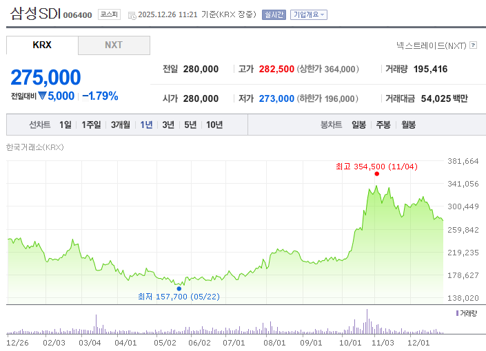 - 삼성SDI의 2024년 12월 26일부터 2025년 12월 26일까지 주가 흐름을 분석해보면, 먼저 상승 구간부터 살펴볼 수 있다. 연초부터 5월 말까지는 전반적으로 주가가 약세를 보이며 최저점인 157,700원(5월 22일)을 기록했다. 하지만 6월부터는 전기차 및 에너지 저장장치(ESS) 시장 성장 기대감이 부각되면서 주가가 점차 회복세로 전환됐다. 특히 10월 초부터 11월 초 사이에는 글로벌 전기차 배터리 수요 증가와 함께 신규 투자 및 생산 확장이 가시화되면서 강한 상승세를 나타냈다. 이 기간에는 11월 4일에 최고가인 354,500원까지 도달하며 단기 고점을 형성했다.